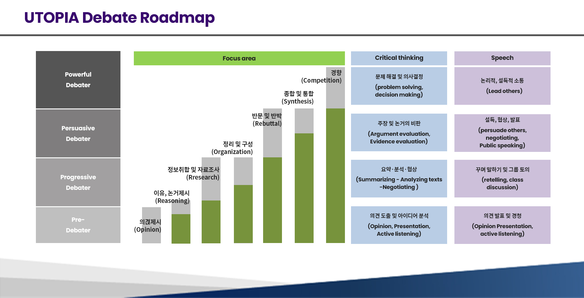 | 목표 | 문장으로 정확히 말하고 읽고 쓰는 습관형성 | Critical Reading Skills | Utopia Level 진입 | 논리적 반박 및 Essay 작성 | Debate 대회 입상 자사.특목고 상위권 기반 조성 | |||||